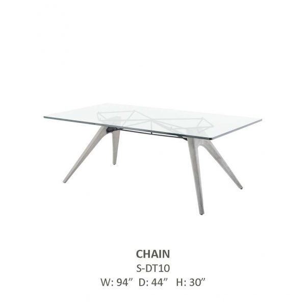 - Stark and sleek, industrial materials and contemporary luxury come together in the Chain dining table. Inspired by mid century modernism, the Chain dining table has a bold, sculpted profile with curved and slanted concrete legs and delicate steel cross bracing matched to a seared oak table top of 94 inches. The result, a striking and architectural unique piece for discerning sensibilities.